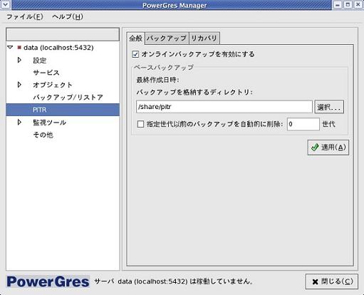PITR の設定を行っている場合には、同様に PITR 画面から『全般』タブの『オンラインバックを有効にする』チェックボックスにチェックを入れて、 『バックアップを格納するディレクトリ』にPITR の設定で設定した共有ディスク上 のディレクトリ名を指定します。