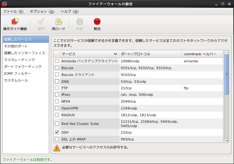 「ファイアーウォールの設定 (system-config-firewall)」が起動します。
